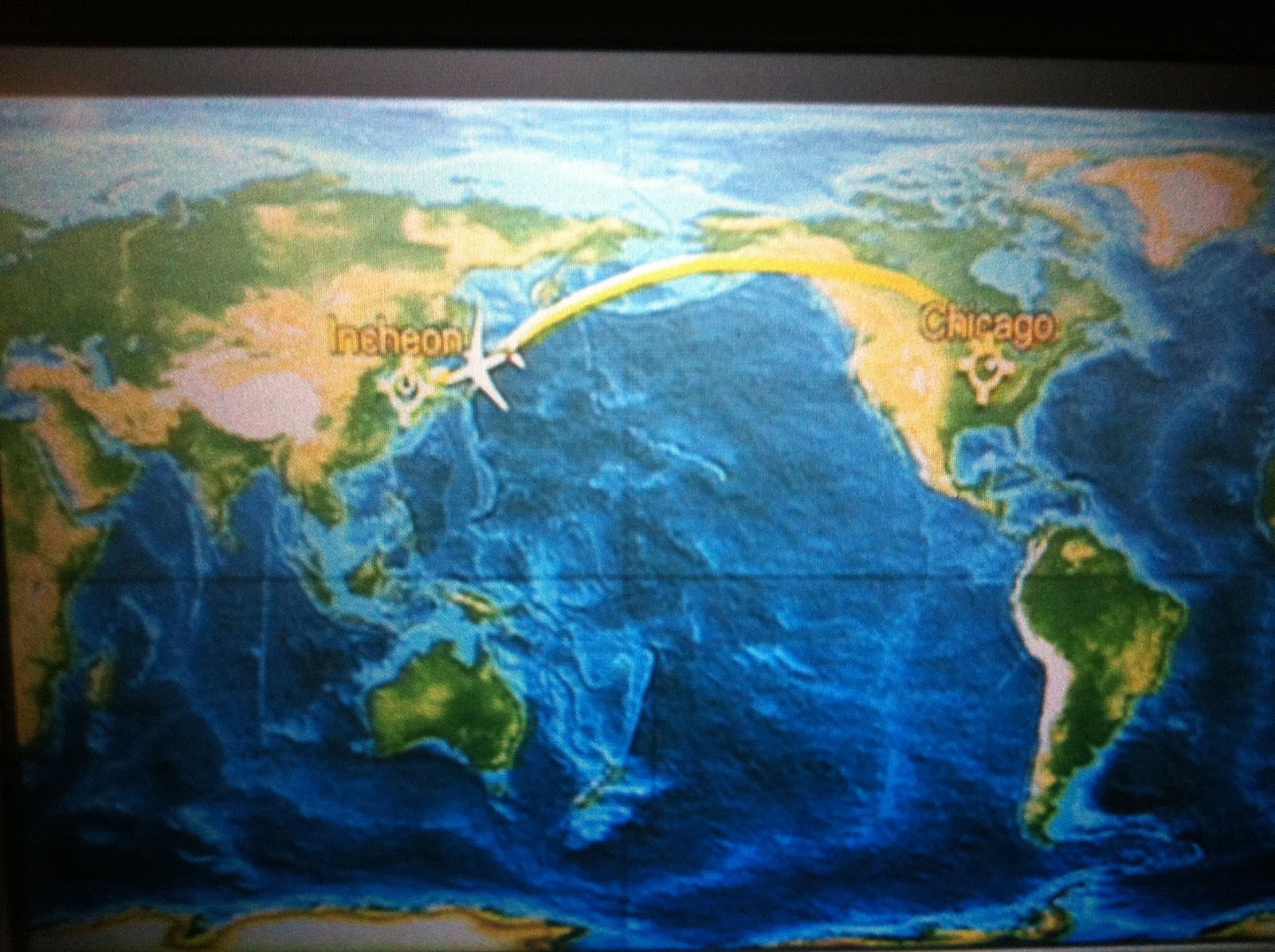 Well, they're closing the shades and turning down the lights. I'm gonna attempt at some shuteye. Its about 4pm Chicago time but 6am Seoul time. We'll land about 4pm their time in Seoul but 2am Chicago time. Yikes. So yeah, I best get some rest. I'll write more later after some other interesting things develop. Cause you know, 14 hours on a plane is just rivited with drama. ;-)